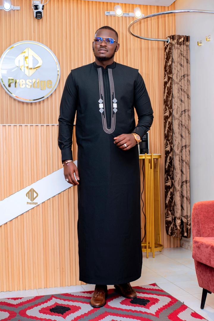 La coupe Diomaye légèrement structurée assure un confort optimal tout en mettant en valeur la silhouette masculine. Les détails blancs sur le col, les manches et les bordures ajoutent une touche raffinée et moderne, faisant de ce boubou un choix idéal pour les grandes occasions.
