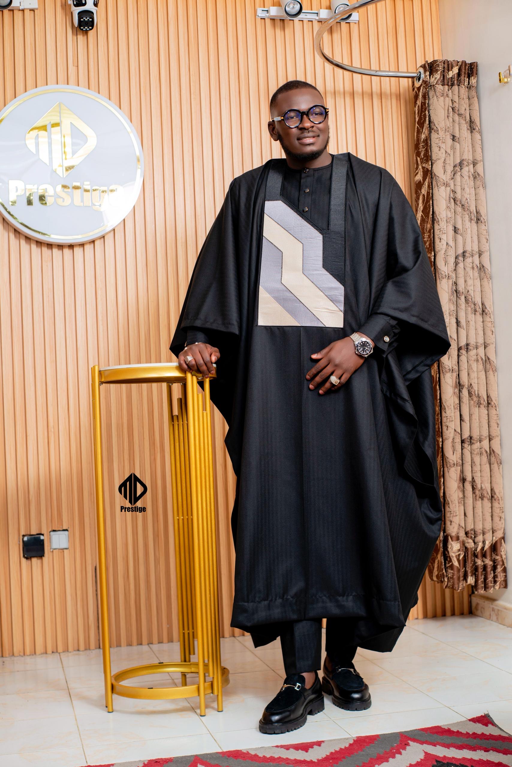 Les motifs damina gris et blanc apportent un contraste élégant qui fait de ce boubou une tenue parfaite pour les cérémonies, mariages et événements prestigieux.