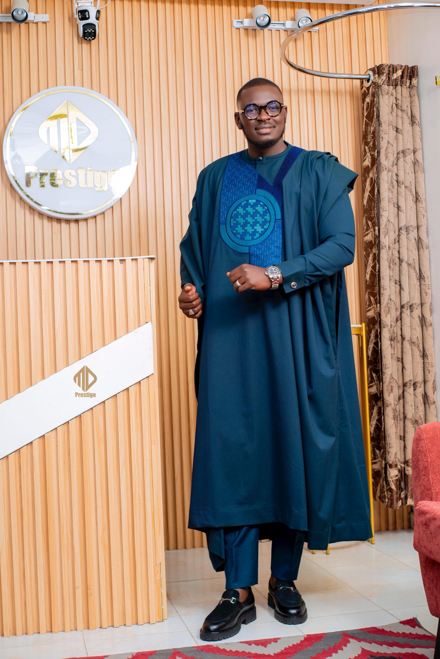 Grand boubou sénégalais 3 pièces bleu océan, conçu pour les hommes qui recherchent élégance, prestige et tradition africaine.